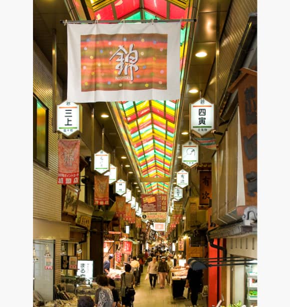 「京の台所」と称されることの多い錦市場。京野菜、琵琶湖の川魚、鱧、ぐじ、笹カレイ、湯葉、生麩など…。京料理の料亭や割烹だけでなく、おばんざいと言われる京都の家庭料理にも使われる新鮮な野菜、魚など旬の食材が一堂に集まってきます。京都独特の食文化にふれるのは他の場所では味わえない魅力です。お店の人から専門的な知識や食べ方などを聞くのも、楽しみの一つです。年末やお正月になると、前に進めないほどの人で賑うのも京の風物詩になっています。