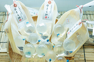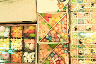 “錦市場の風情を大切にしたい”というご主人の想いが、漆喰の壁や木を多く使った内装から伝わってきます。京都産であることにこだわり、可愛いお菓子、楽しく買えるお菓子を少量ずつ販売しています。食べる宝石のような琥珀糖は見るだけでウキウキします。和三盆でつくられた干菓子は季節ごとに変わります。