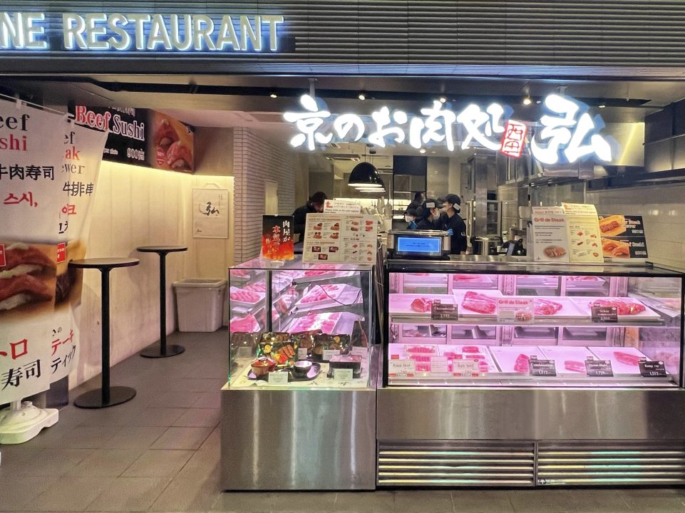 京のお肉処弘唯一の、テイクアウト・イートインの両方が楽しめるお店です。名物は「牛トロ炙り寿司」と「ステーキスティック」。ショーケース内のお客様のお好みのステーキをプロが目の前で焼き上げる「グリルdeステーキ」もぜひ。