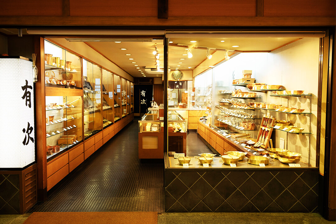 永禄3年(1560年)に「刀鍛冶 藤原有次」として創業という、永い歴史を持つお店です。屋号の「有次」は創業時の名に由来しています。店内には、その永い伝統を色濃く反映するかのような多種多様な庖丁や鍋など職人の手仕事による料理道具が並びます。京料理の一流料理人から一般家庭まで幅広い層から支持されています。