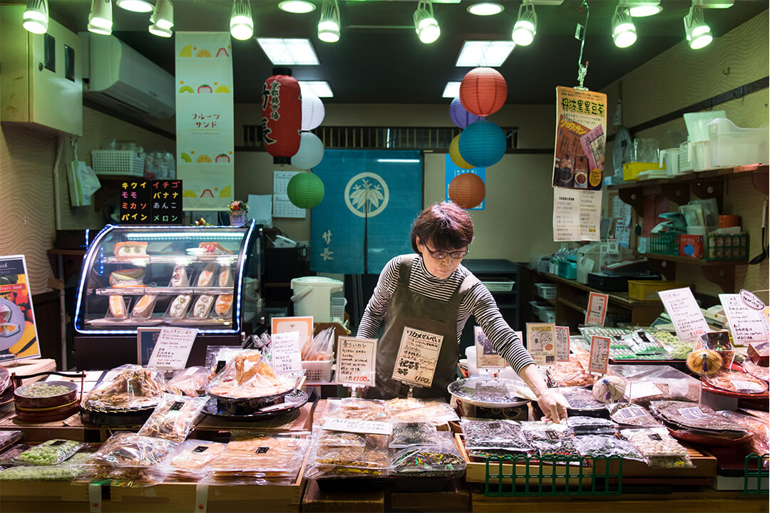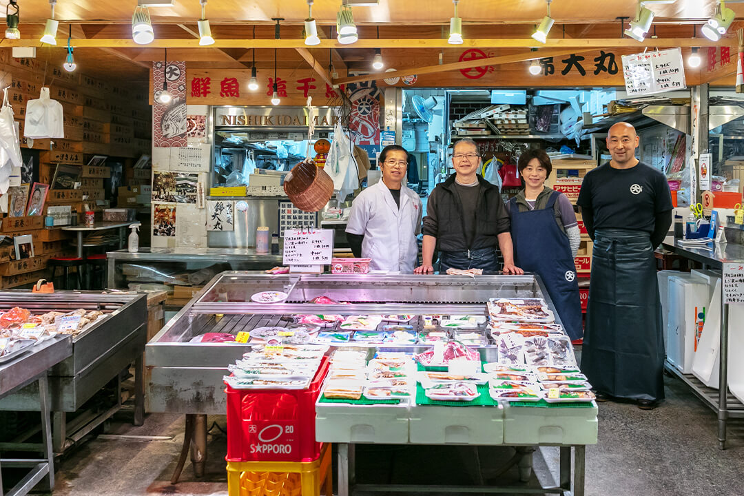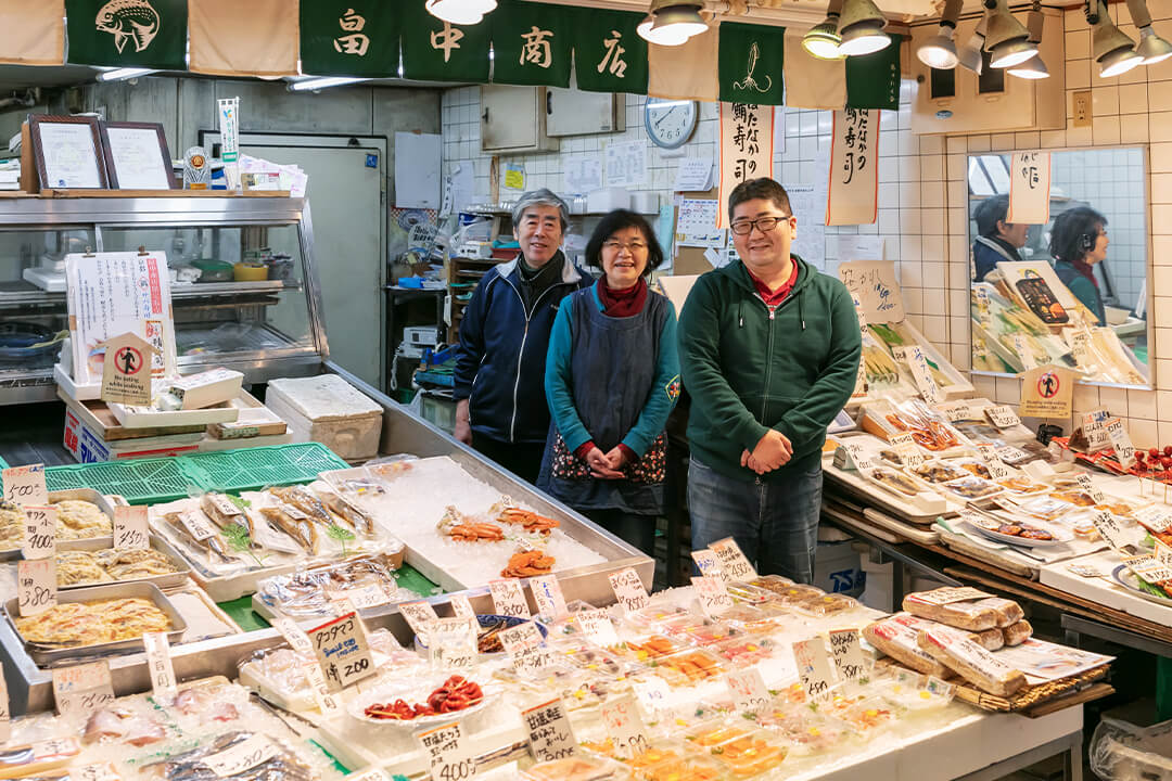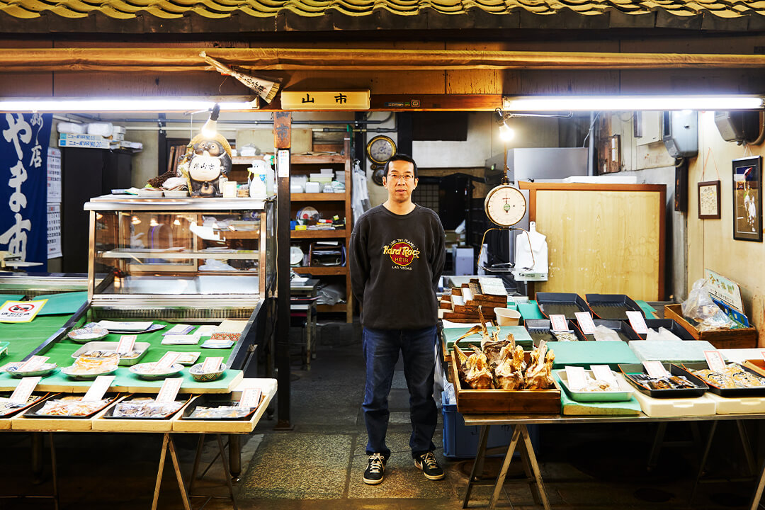 創業75年。現代は3代目。「100年以上の店が多い錦市場ではまだまだ中堅です」と謙遜して語る、ご家族で運営する庶民的な魚屋さんです。鮮魚、お造り、焼き物、煮物。現在は持ち帰りできる加工品にチカラを入れていて、自家製の子持ち鮎山椒煮、味噌漬け、ヘシコ、ちりめん山椒など幅広くとり揃えています。