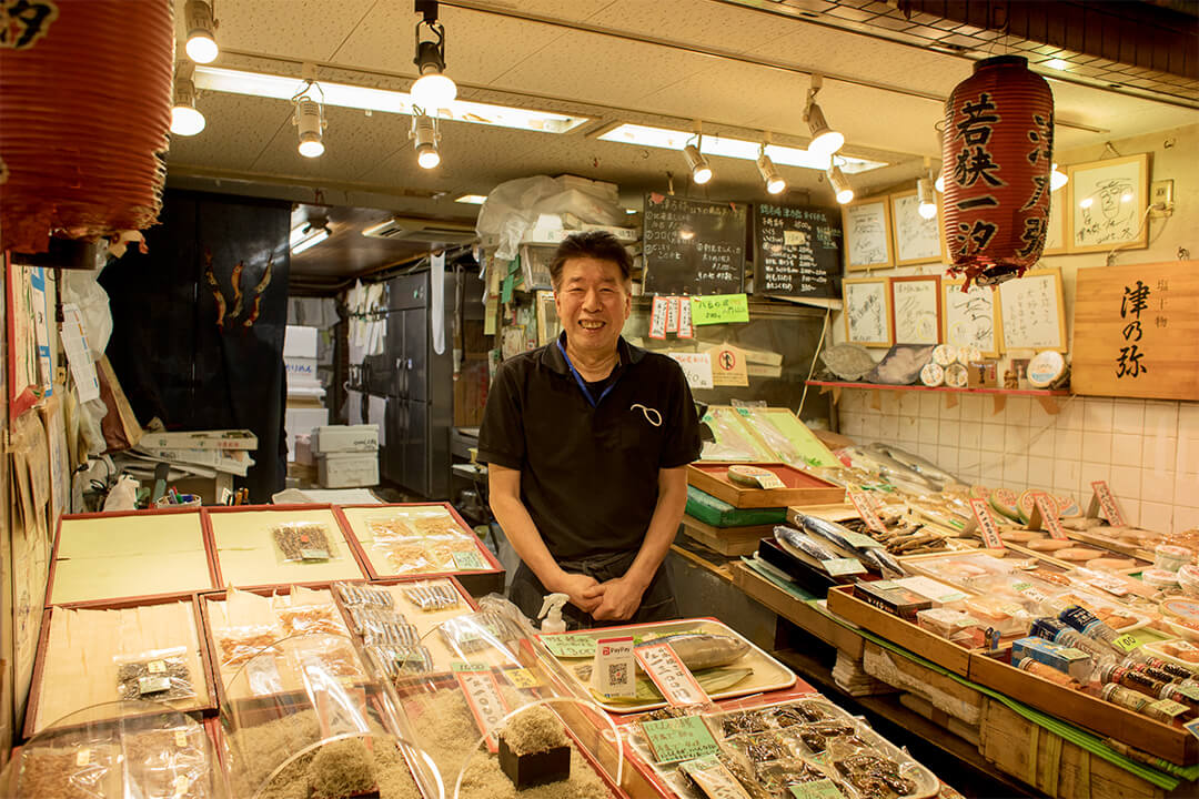 「常に最高の状態の魚を仕入れること」をモットーに、昭和3年から続くお店です。現代3代目で、すでに90年を超えています。塩干ものやひと塩ものを扱い、主力商品はちりめんじゃこ、ぐじ、カレイやカマスの一夜干しなど。中でもへしこ、若狭カレイなど若狭物の海産物や珍味にこだわっています。