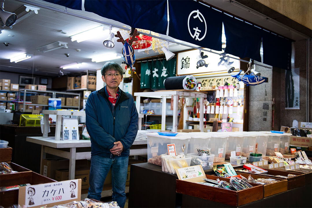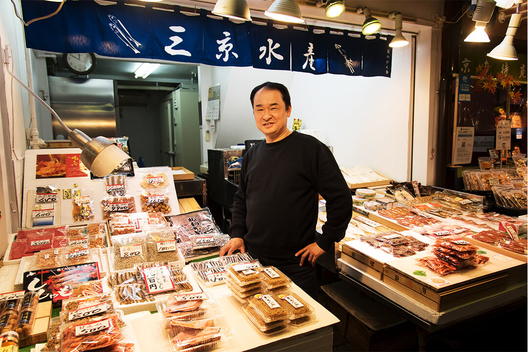 創業の地は大阪の中央市場。戦時中に祖父の出身地の京都に戻り、錦市場で開店。大阪時代から主力商品だった剣先するめをはじめ、タラコやちりめん雑魚などの塩干もの、カラスミやこのこなどの珍味の卸と小売をしています。国内産の美味しい海産物を手ごろな価格でお届けすることにこだわり続けています。