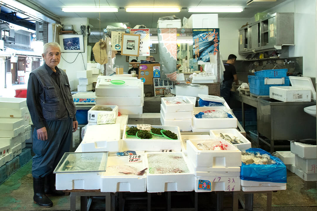 店頭に並ぶ串焼きに思わず目が行きます。写真を撮る人も多いようです。こちらは昭和25年に先代が開業した鮮魚店。ブリ、鯛、鰆...季節ごとに変わる旬の鮮魚は、50年間市場に通ってきたご主人の目利きで選んだ新鮮なものばかり。イワシ、サバは生姜で炊き、白身魚は程よく味付けをし、それぞれの持ち味を生かしながら店の奥で調理します。