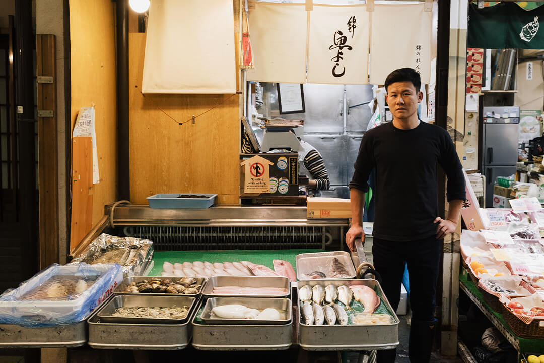 創業75年。現代は3代目。「100年以上の店が多い錦市場ではまだまだ中堅です」と謙遜して語る、ご家族で運営する庶民的な魚屋さんです。鮮魚、お造り、焼き物、煮物。現在は持ち帰りできる加工品にチカラを入れていて、自家製の子持ち鮎山椒煮、味噌漬け、ヘシコ、ちりめん山椒など幅広くとり揃えています。