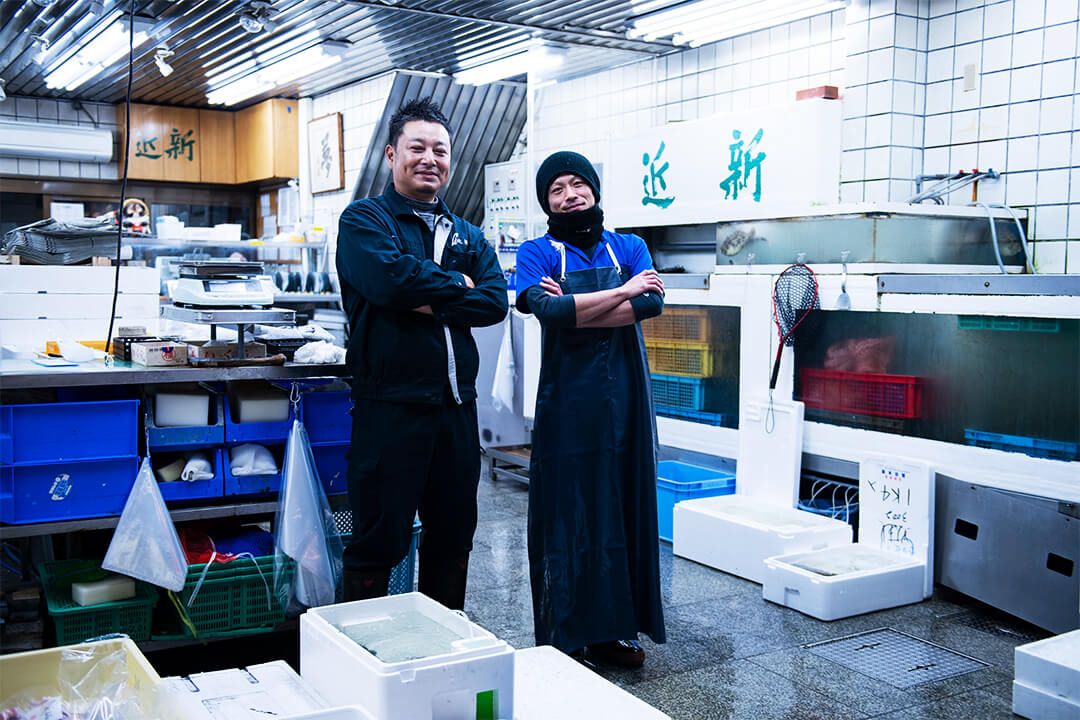 この店の朝は早い。朝5時ころにはもう活動が始まります。小売りは一⻫せず、プロのためだけのお店です。鮮魚から冷凍まで魚関係ならなんでもある心強いお店。京都や滋賀はもとより全国の料理屋さん、旅館、飲食店さんなどへ専門的な商品を納品しています。専門性の高い、錦ならではのお店です。