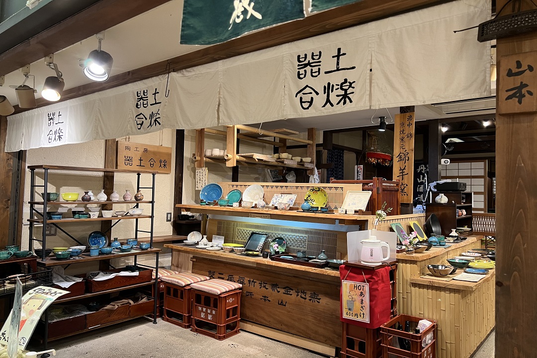 ご主人の洋輔さんがロクロをまわし、奥さんの千恵さんが絵付けをする。ふたりが二人三脚で創作した陶器を販売しています。鰻の寝床と呼ばれる、昔ながらの京の町屋の奥に土蔵があり、窯があります。ロクロは店内にあり、タイミングが良ければ作陶風景に出会えます。店頭では丹山酒造の試飲販売を行っています。