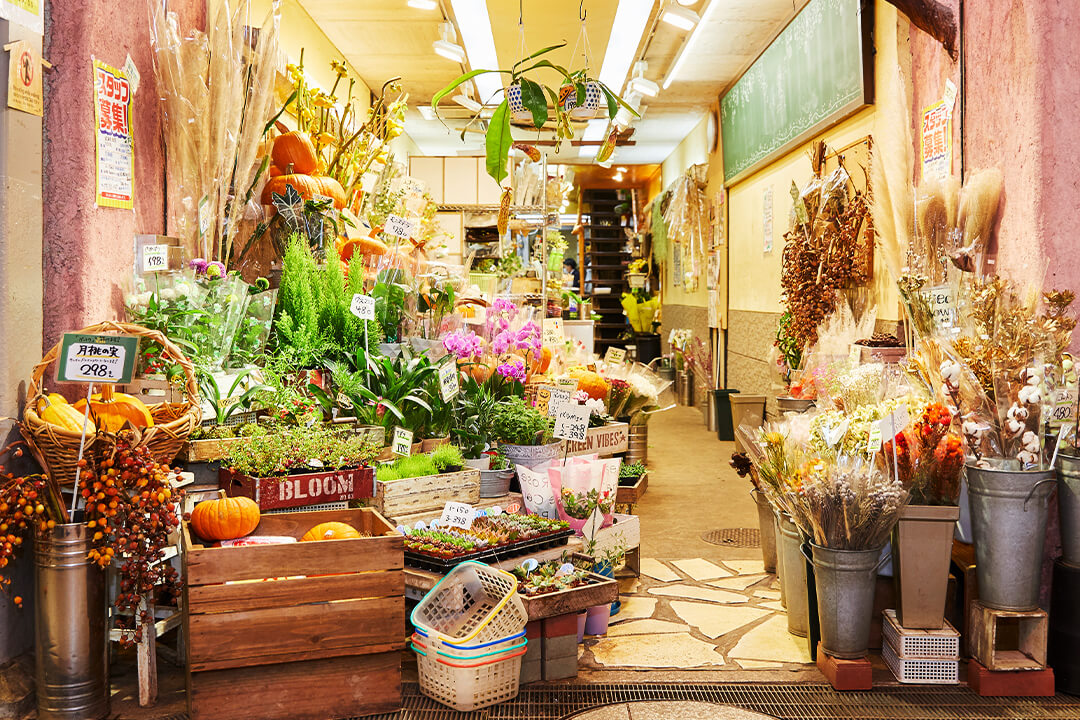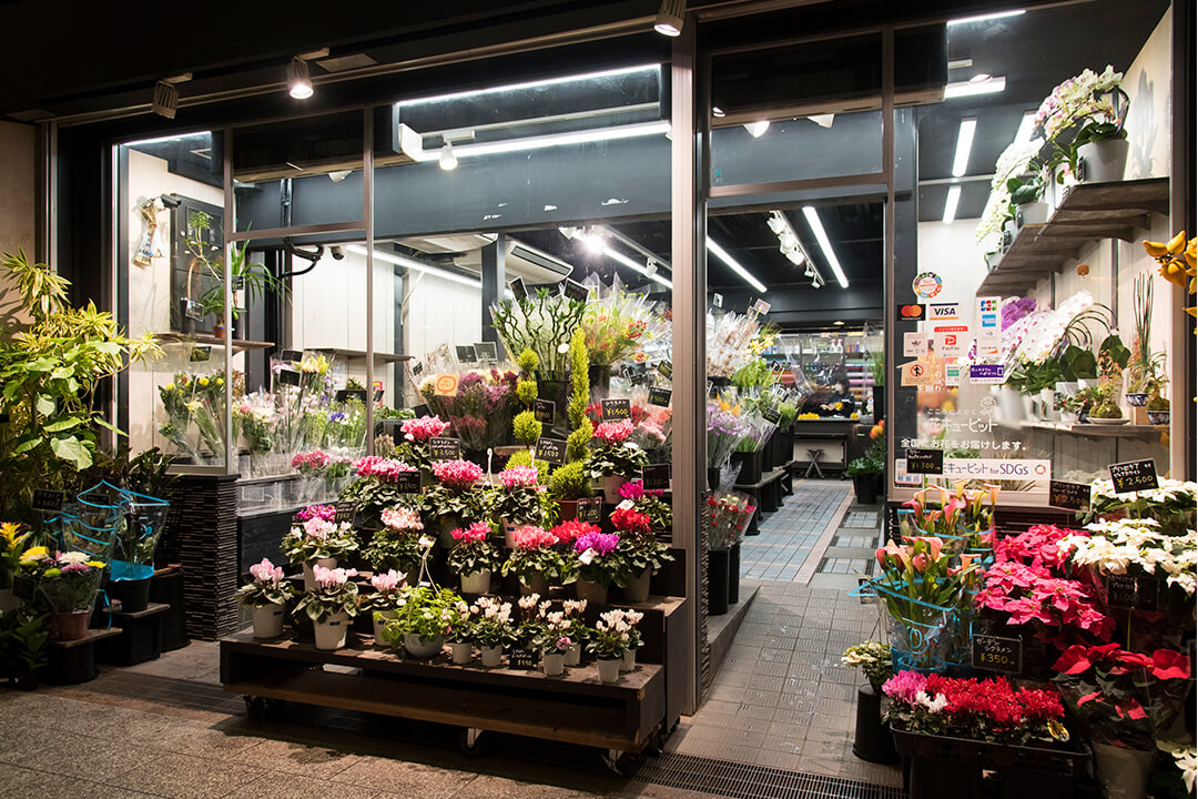 種類も量も京都有数という規模の生花店。広くて明るい店内に生花・鉢物がたくさん並びます。