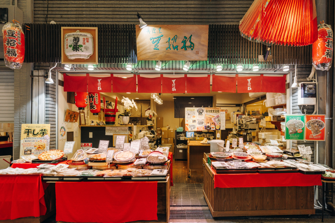 丹波黒の豆菓子を中心に乾珍味などおつまみも販売しています。店舗奥ではご飲食も頂けます。