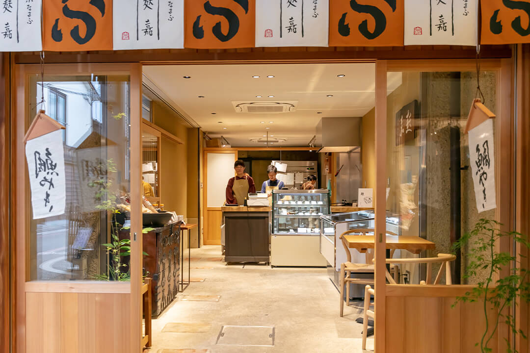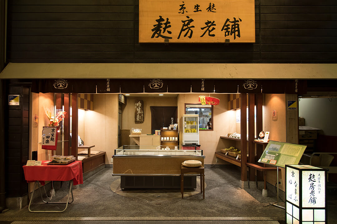 この場所で製造し卸と小売りをしている京生麩の専門店。創業は天保年間(1831~1845年)にまで遡ります。店頭ではしろ・あわ・よもぎなどのさまざまな創作生麩を販売。そのほか自家製の田楽味噌をぬった「生麩の田楽」、こし餡と青のりを生麩の生地で包んだ「麩まんじゅう」もあります。