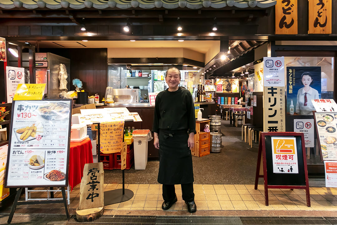 ゆったり落ち着く昭和レトロな空間で味わう京うどん、同じお出汁で作る京風おでん、串カツなどが人気です。うす揚げ、湯葉、生麩、九条ねぎなど京の食材を大切にしながら、新しい食を提案しています。京都の地酒も豊富に揃っています。食欲を満たしながら、昼間からチョイ飲み使いできるのが、この店の特長です。