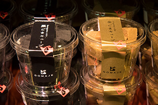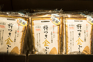店頭で杵と臼でごまを搗くスタッフの姿が目を引きます。店の入り口には、搗きたてのごまの良い香りが漂います。ごまは擦るのではなく搗くものだそうです。擦るとどうしても苦味が出るとか。看板メニューの「杵搗き金ごま」を中心にごまのお菓子や調味料などを取り揃えたごまの専門店です。