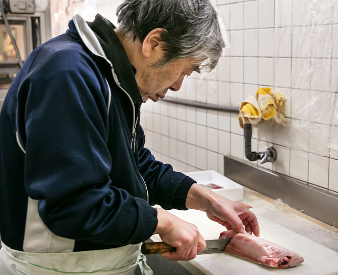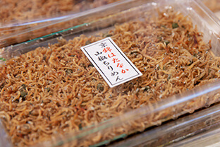 創業75年。現代は3代目。「100年以上の店が多い錦市場ではまだまだ中堅です」と謙遜して語る、ご家族で運営する庶民的な魚屋さんです。鮮魚、お造り、焼き物、煮物。現在は持ち帰りできる加工品にチカラを入れていて、自家製の子持ち鮎山椒煮、味噌漬け、ヘシコ、ちりめん山椒など幅広くとり揃えています。