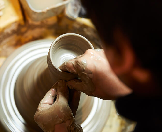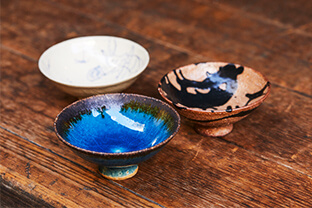 ご主人の洋輔さんがロクロをまわし、奥さんの千恵さんが絵付けをする。ふたりが二人三脚で創作した陶器を販売しています。鰻の寝床と呼ばれる、昔ながらの京の町屋の奥に土蔵があり、窯があります。ロクロは店内にあり、タイミングが良ければ作陶風景に出会えます。店頭では丹山酒造の試飲販売を行っています。