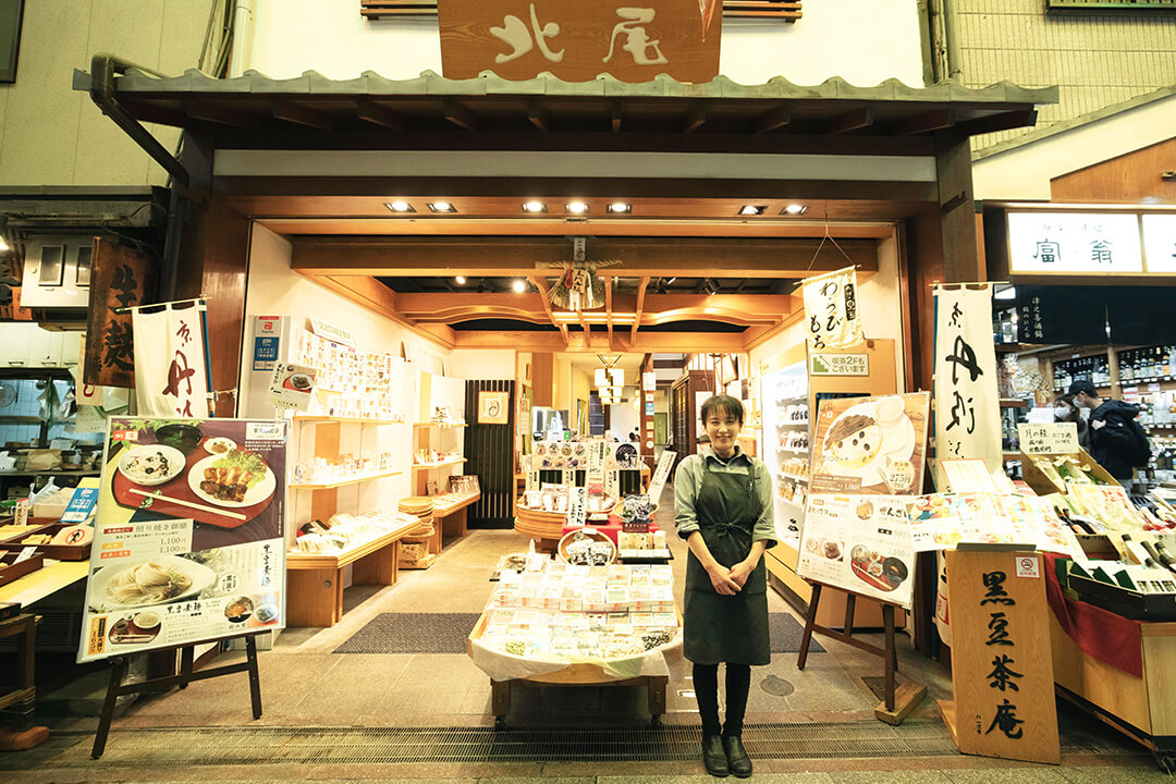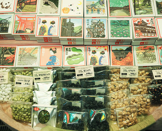 文久2年(1862年)創業の京都丹波産の黑豆や小豆を商う豆の専門店です。店内を見回すと、豆、豆、豆、豆、豆づくし。生豆、煮豆、黑豆茶、黑豆菓子。豆の専門店が吟味を重ねた素材で作られた製品がズラリと並んでいます。2階には喫茶が併設されています。