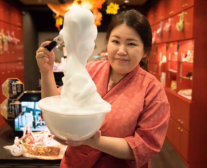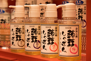道行く人が店頭に置かれたカラフルな見本に触れる姿を、引きも切らず見受けます。皆さん、触ってみては「きゃー、プニュプニュしている」と、声を上げます。じつは、これぞ、蒟蒻芋から作られたせっけん「蒟蒻しゃぼん」。蒟蒻のセラミド効果やスクラブ効果に注目して作られた製品です。肌はしっとり、ツルツルになります。