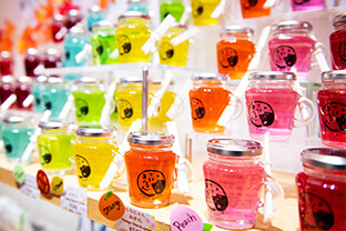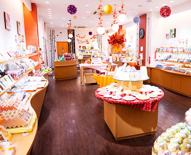 可愛いお菓子と雑貨のお店と、ひと言では表現できないほど、いろんな“可愛い”が集まるお店です。カラフルで明るい店内をざっとご紹介すると、色とりどりの金平糖や京あめ、自社工房で作られるオリジナルクッキー、京都限定のコスメ・パック・香水・ネイル、和風のピアスやイヤリング。京都の地酒もたくさん揃っています。