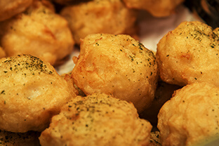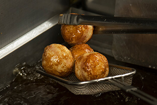 すり身はいまでも頑なに石臼を使います。ステンレスでは材料がふちにつかないが石臼だとふちにつくので、何度も手を入れてかき混ぜるからすり身がなじむ。そこが良いそうです。じつは、かつて錦市場に数軒あったという練り物と揚げ物の製造販売店も、いまはこの店だけです。おでん種や本格蒲鉾だけでなく、創作揚げ物まで揃います。