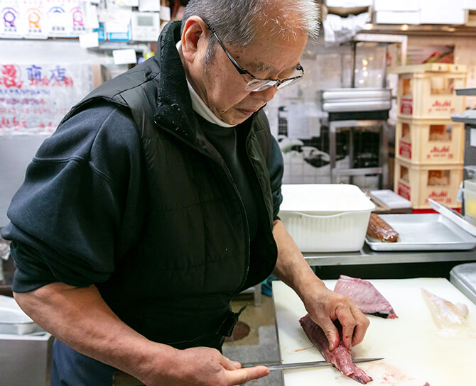 店頭にはじつに多種多様な鮮魚、塩干物、焼き物・味噌漬・寿司などの加工品が並んでいます。その一つ一つがどれも美味しそうで、錦小路をいく人の目を引きます。朝6時から準備し、その日の造り、うなぎや塩さばなどの焼き物、鯛のあら炊きなどの煮物が並んで行きます。これらはすべて、お店でも食べられるよう席が用意されています。