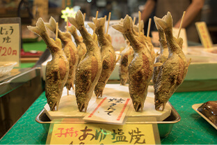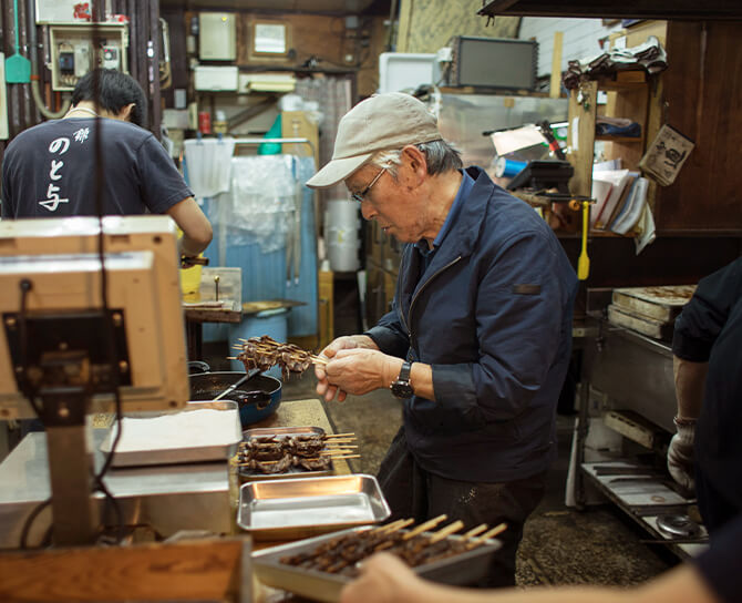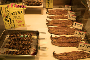 京都市内でも数は少なく、錦市場でも3軒しかないという川魚の専門店です。店頭に並ぶ商品は店の奥で開いたり、ぶつ切りにしたり、大鍋で炊いたり。お客さまが滅多に目にしないような作業で加工されています。また店の奥では「奥の商売」と称される、懐石料理店への納品準備もしています。