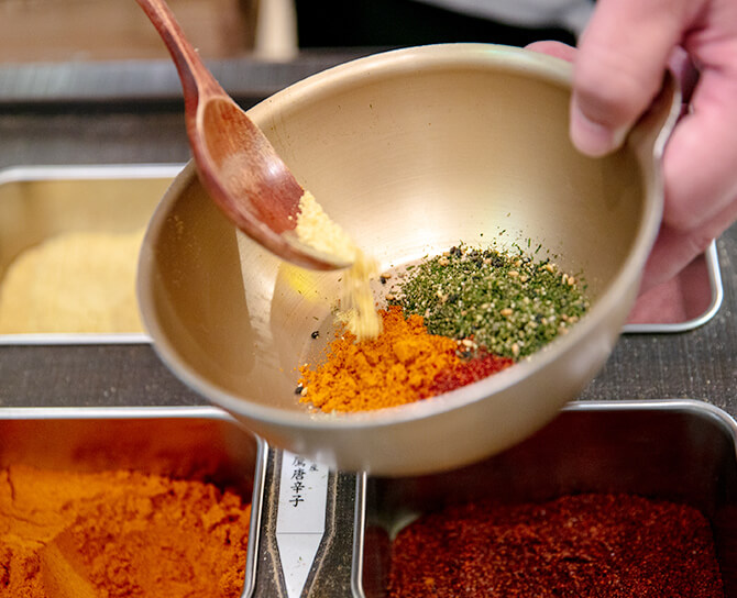 店頭では、好みに合わせてオリジナルな配合をしてくれる「調合七味」の販売をしています。「山椒を多めで」とか「辛さは少し控え目で」とかの注文ができます。