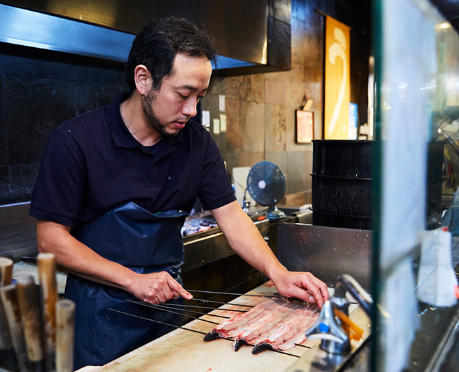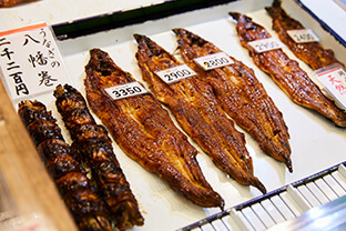 明治45年(1912年)創業のうなぎで名高い川魚の店。小さな間口の店ですが、その評判は広く響き渡っています。うなぎは愛知県産の国産うなぎ、岡山県児島湾で獲れた瀬戸内の天然うなぎにこだわります。秘伝のタレを付けて炭火で丁寧に焼きあげます。お店では、現在4代目の店主が頑固に作り方を守っています。