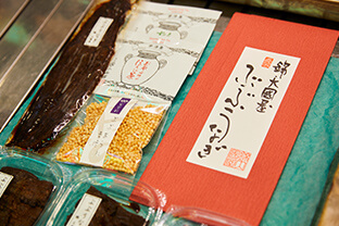 鮎、モロコ、うなぎなどは店の奥の水槽に生きたまま泳がせています。新鮮なものをここから出して、焼いたり煮たり佃煮にしたりしています。シーズンには希少な天然青うなぎをご用意しております。