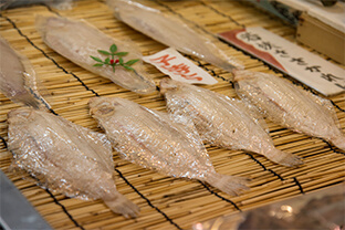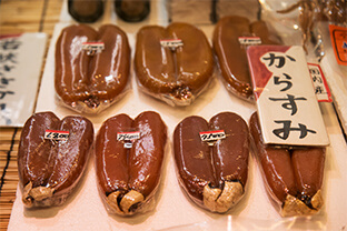 創業の地は大阪の中央市場。戦時中に祖父の出身地の京都に戻り、錦市場で開店。大阪時代から主力商品だった剣先するめをはじめ、タラコやちりめん雑魚などの塩干もの、カラスミやこのこなどの珍味の卸と小売をしています。国内産の美味しい海産物を手ごろな価格でお届けすることにこだわり続けています。