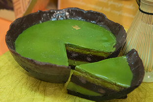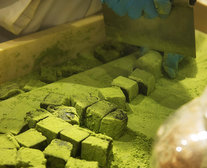 店頭の看板や暖簾の色から察しがつくように、抹茶スイーツ専門店です。抹茶は宇治の抹茶にこだわり、お濃茶をテーマにした店になっています。1階は抹茶スイーツ館で、さまざまな抹茶スイーツを販売しています。2階はカフェで、わらび餅、パフェ、あんみつなどのメニューがあります。店頭で実演している石臼でひいた一番茶のひき立て抹茶を使用しています。