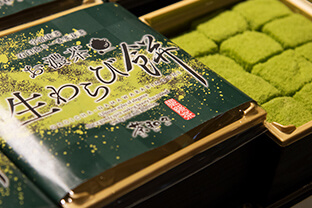 この店限定のお濃茶わらび餅は、本わらび粉を使用し、生地にも抹茶を練り込んでいます。お濃茶生わらび餅、本わらび餅(きなこ、抹茶)の3種類があります。