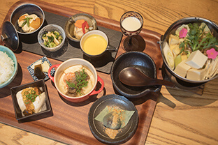 錦市場の西入りのたつ若冲のモニュメントの側にあるお店。豆腐の販売と豆腐料理のレストランを営んでおります。レストランはランチのみのセットメニューになります。豆腐ハンバーグ、おからコロッケ、麻婆豆腐豆乳鍋をメインに季節に合わせたメニューや一品とともにヘルシーなランチをお楽しみいただけます。販売では豆腐・京あげ・絹厚揚げ・豆乳・生麩・ひろうす、おから等も取り揃えております。