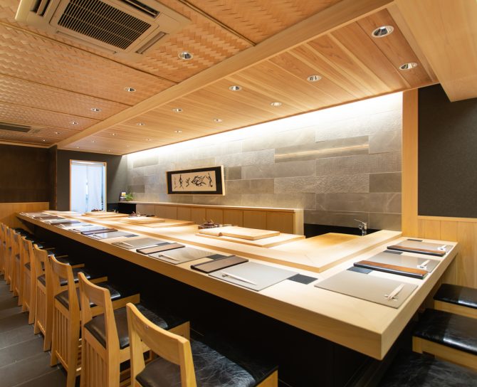 檜の一枚板のカウンターでこだわりの江戸前鮨を提供します。