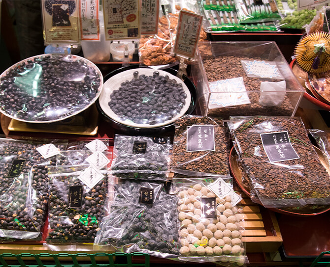 元々⾖をメインにしていた店なので、⿊⾖の⾖菓⼦や⿊⾖茶などがおススメです。三⽇間遠⾚外線で炒った「⿊⼤⾖炒⾖」は噛めば噛むほど、じんわり⿊⾖の⽢味が出てきます。