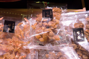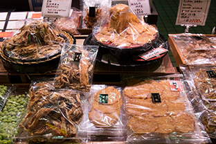 いろいろな商品が並んでいます。どれもこだわりの⿊⾖の⾖菓⼦と海産の⼲物です。どちらもカラダに良いのが共通点。袋⼊りの⼲物のオススメは鯛、⽳⼦、ワカメ、炙りイワシ、⼲し海⽼など。この店には異⾊の「フルーツのサンドイッチ」はイチゴ、パパイヤ、イチジク、マスカットなど種類が豊富です。