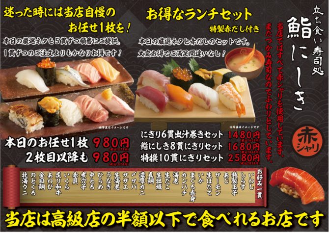 ごく小さいお店ですが、新鮮なネタを使用した本格的なお寿司が楽しめます!しかも高級店の半額以下で味わえ、大変お得です。