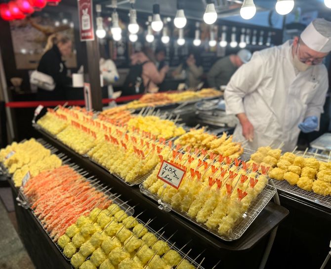 職人の技が際立つ天ぷらの専門店です。大きなぷりぷりの海老や独自で年間契約した鱧など厳選した食材を使用し、出来立ての熱々を提供しています。店頭にずらっと並ぶ天ぷらは店の前を通る方々に圧倒的に目を引きます。