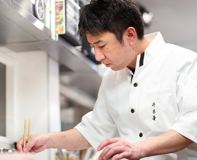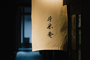 錦小路に立つ看板を目印に鰻の寝床のような路地を進むと、目の前が開け店が現れます。ドラマチックなアプローチに否が応でも気分が盛り上がります。店名の「斗米庵」は若冲の雅号。材料は錦の名店から旬の食材を仕入れ、料理⻑自ら品物を見極めて、どう美味しくできるかを常に考えて料理しています。