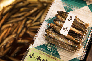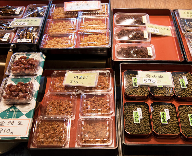 錦市場に店をかまえて約90年。親子ふたりで切り盛りする家庭的なお店です。店頭のガラスケースを見ると鶏肉店かと錯覚しますが、鶏肉と川魚を中心に扱うお店です。川魚は滋賀県から直接仕入れています。鮎の甘露煮、モロコ醤油煮など自家製のものも多くあります。なんと言っても、合鴨がこの店の人気商品です。