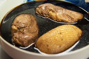 この店の人気商品は「蒸し鴨ロース」。炊くと身が縮むので、酒・醤油・砂糖の煮汁に漬け込んでそのまま蒸します。フワッとしたまま火がとおり、良い具合に仕上がります。