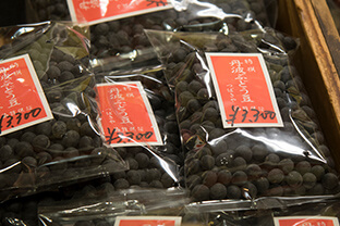 おもに雑穀や粉物を扱っています。てっぽう豆、とら豆、けしの実、もち粉、寒梅粉、道明寺粉など。昔から錦市場に来れば手に入ったような、高いけどホンモノの品が手に入ります。