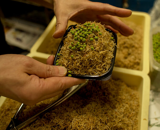 産地やサイズ違いで品揃えが豊富なちりめんじゃこを、常時7種類は揃えています。美山や和歌山の山椒を使った自家製ちりめん山椒は、無添加の昔ながらの味を守っています。