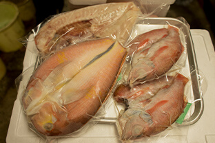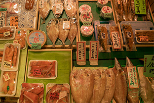 「常に最高の状態の魚を仕入れること」をモットーに、昭和3年から続くお店です。現代3代目で、すでに90年を超えています。塩干ものやひと塩ものを扱い、主力商品はちりめんじゃこ、ぐじ、カレイやカマスの一夜干しなど。中でもへしこ、若狭カレイなど若狭物の海産物や珍味にこだわっています。