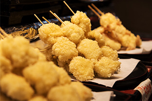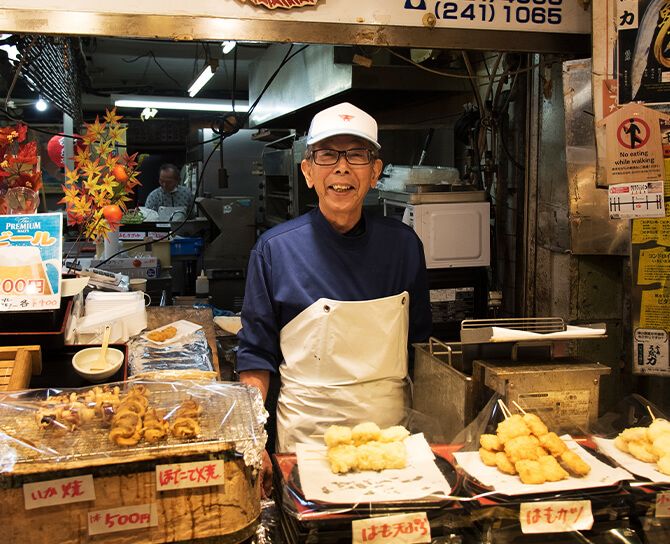大正8年から続く焼魚の専門店です。店内には香ばしく焼き上がっていく魚の良い香りが漂います。この店ではとくに鯛と鱧にこだわっています。祝い鯛、焼き鱧、中でも店内で食べることができる鱧天(鱧の天ぷら)と鱧カツは絶対のオススメだそうです。祝い鯛は地方からの注文にもお応えして発送しています。