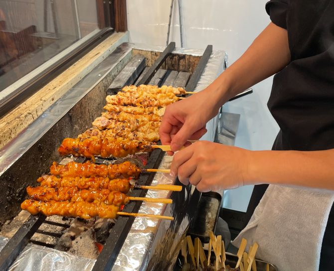 炭の火加減を調整しながら、職人が一つひとつ丁寧に焼き上げております。店内には香ばしい香りが漂い、焼き鳥屋ならではのライブ感を感じられます。