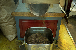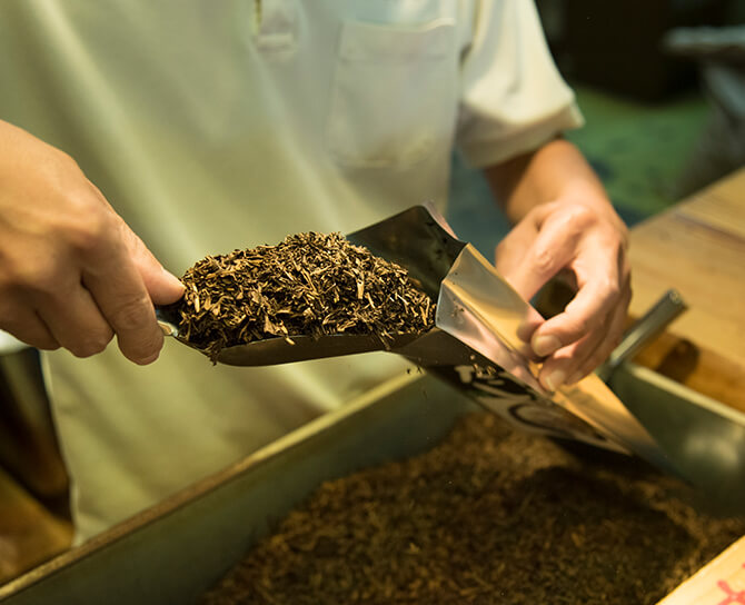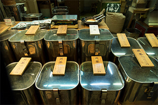 店の前を通ると、店頭で店主が来る⽇も来る⽇も焙じているほうじ茶の⾹ばしい⾹りが⿐腔を刺激し⼈を誘います。京都ではほうじ茶のことを番茶と呼びま す。番茶のばんは「おばんざい」のばんと同じで普段使いという意味があるので 家庭で普段よく飲まれているお茶を指すという説があります。